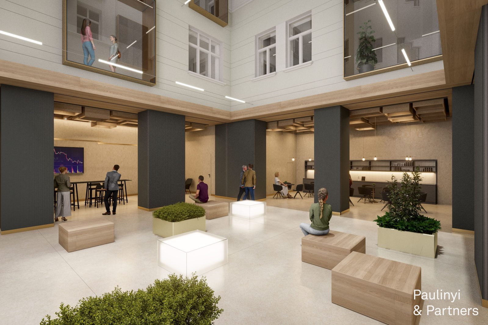 During the renovation of the listed office building at Nádor Street 21, we were determined enough to resolve a long-standing absence: the creation of a truly central community space. The building originally lacked a representative reception or communal area, which is an essential component of contemporary office environments.